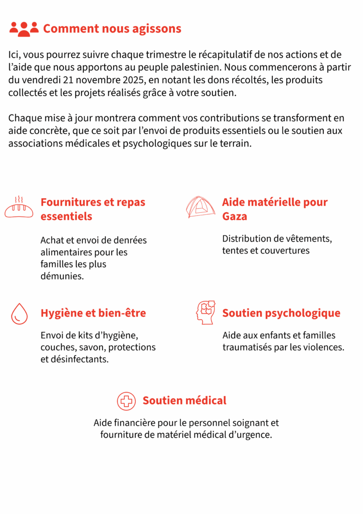Vous pouvez dès maintenant contribuer à notre première mission humanitaire et aider les familles de Gaza à retrouver un peu d’espoir.